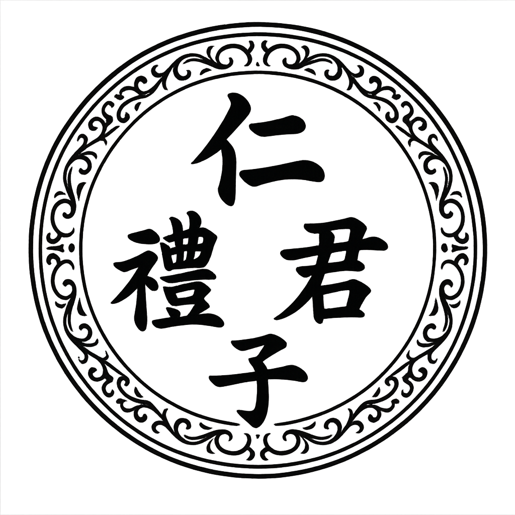 Hinweis: In unserem Emblem: Trotz mehrfacher Versuche mit verschiedenen Tools ließ sich das korrekte Schriftzeichen-Paar für „Junzi“ (君子) nicht als einheitliche grafische Form darstellen. Das gezeigte Emblem nutzt daher eine stilistische Annäherung – nicht die exakte Form.