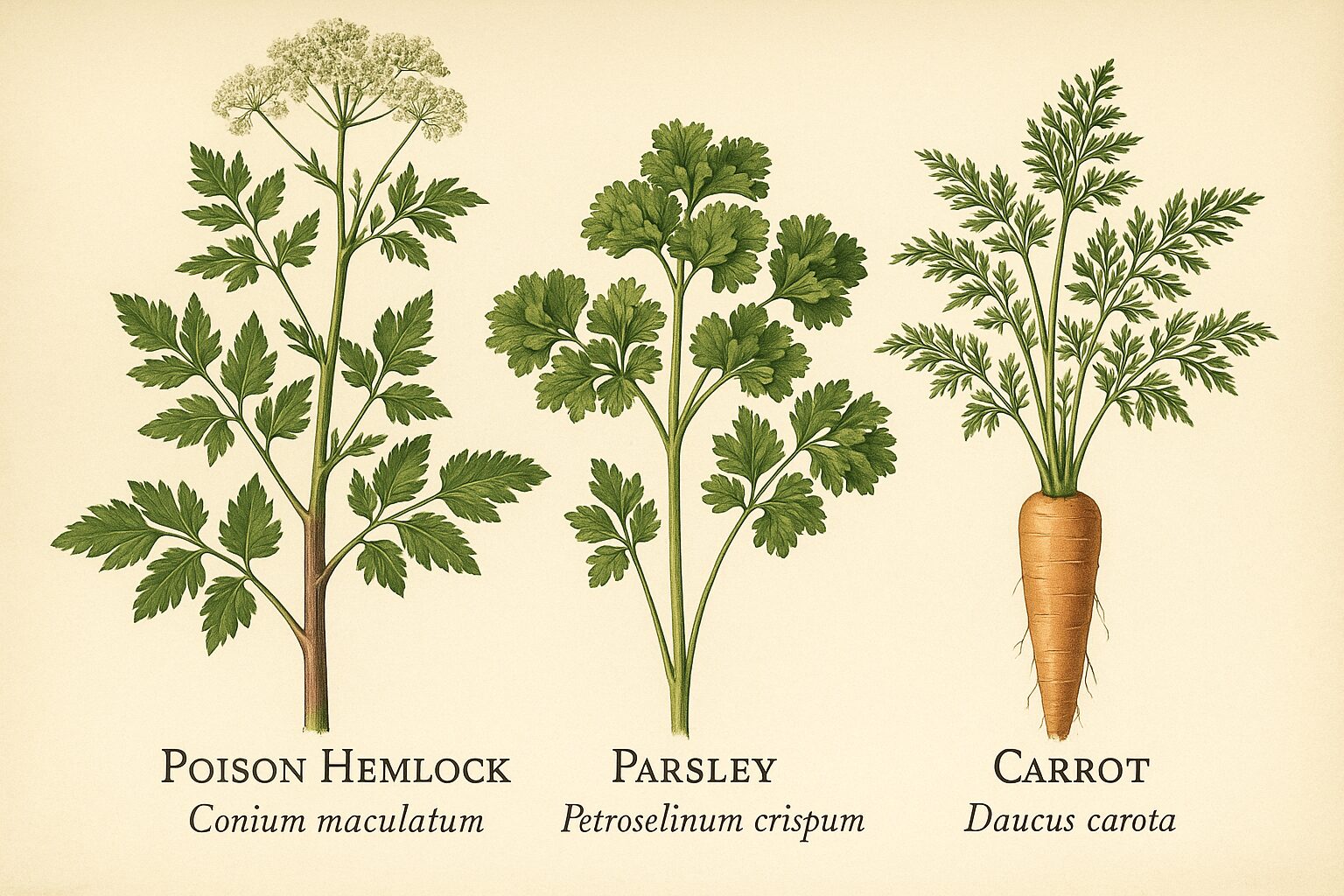 Der Gefleckte Schierling (Conium maculatum) gehört zur Familie der Doldenblütler und sieht auf den ersten Blick harmlos aus – wie Petersilie oder Wiesenkerbel. Sein Gift, das Coniin, blockiert jedoch die Nervenleitung zu den Muskeln. Der Körper wird nach und nach gelähmt, während das Bewusstsein klar bleibt. Bei Sokrates’ Hinrichtung wurde aus dieser Pflanze ein Trank zubereitet. Die Lähmung stieg langsam von den Beinen aufwärts, bis die Atmung aussetzte. Es war kein schmerzhafter Tod, sondern ein stiller, bewusster Abschied – fast wie ein letzter Gedanke, der sich vom Körper löst. Botanisch ist der Schierling eng verwandt mit Petersilie, Sellerie und Möhre – eine merkwürdige Nähe von Heilpflanzen und Gift. Philosophisch betrachtet steht er bis heute für die Grenze zwischen Wissen und Erfahrung, Denken und Leben.